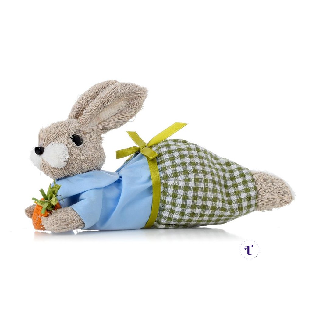 VEĽKÁ NOC Slamené dekorácie ZAJAC LEŽIACI MOD/ZEL OBLEČ., MRKVIČKA, PRIADZA 12*19*12CMDodatočné parametre